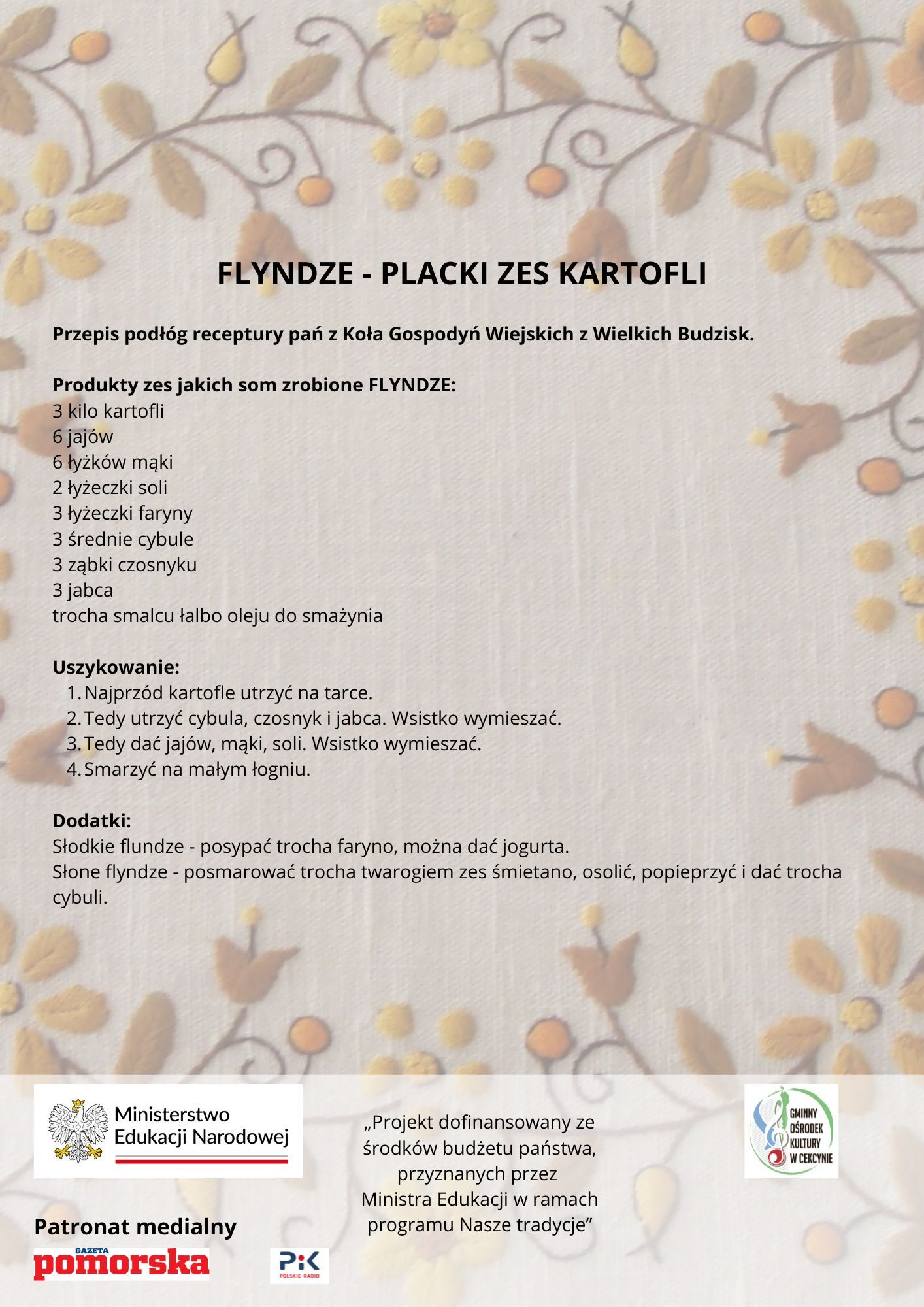 Dzięki zaangażowaniu członkiń Koła Gospodyń Wiejskich oraz miejscowej świetlicy w Wielkich Budziskach uczestnicy smażyli regionalne flyndze, czyli placki ziemniaczane. Spotkanie pozwoliło poznać borowiackie smaki wszystkimi zmysłami. Natomiast o tradycjach Borów Tucholskich opowiedział nam edukatorka regionalna.