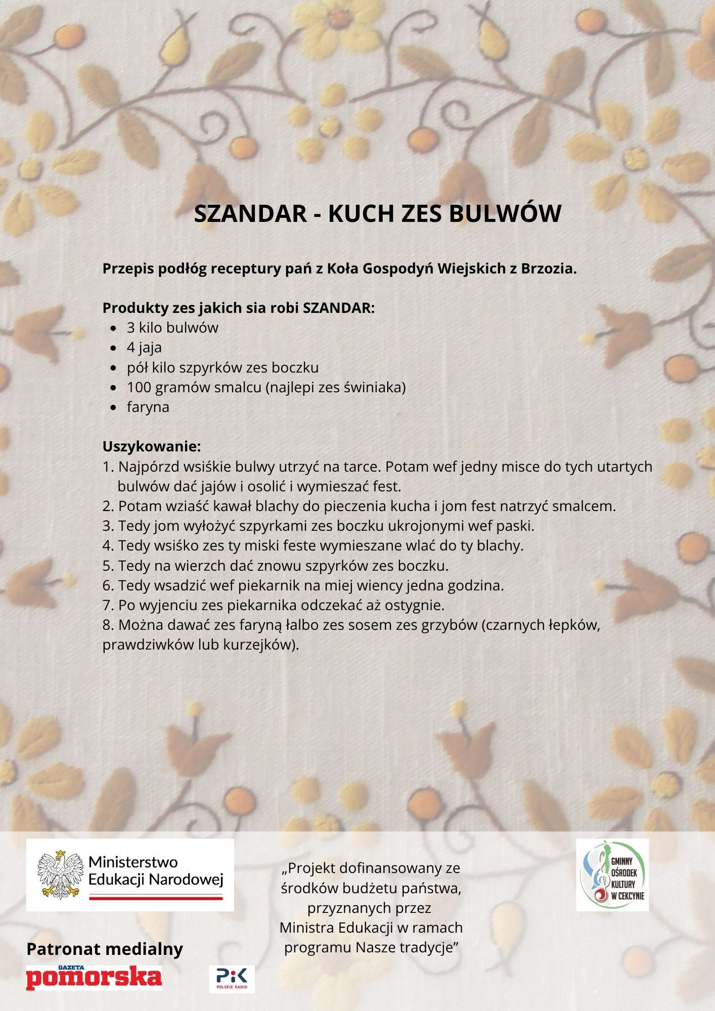 We współpracy z Kołem Gospodyń Wiejskich i miejscową świetlicą w Brzoziu uczestnicy przygotowali szandar — tradycyjną borowiacką potrawę z ziemniaków. Spotkanie pozwoliło odkrywać dziedzictwo kulinarne Borów Tucholskich wszystkimi zmysłami. O tradycjach regionu opowiedział nam edukatorka regionalna.